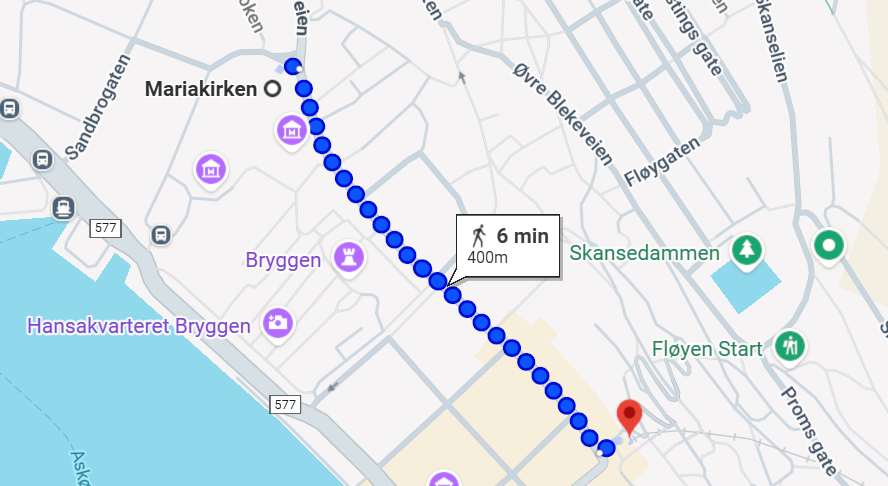 Etter vielsen i Mariakirken går ferden videre til Fløyen. Fløibanen vil frakte gjestene fra banens nedre stasjon på Vetrlidsallmenning i Bergen sentrum, ca. 400 meter fra Mariakirken. Gjestene tar enkelt Fløibanen både til og fra lokalet. Siste retur til sentrum går kl: 02:00.
